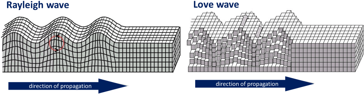 As we know, Earthquakes do not just start and then simply stop once the displacement of rock has finished. The released energy produces waves within the interior of the earth that bounce around and move in all directions from the hypocenter. Unlike the epicenter, which is the location on Earth’s surface directly above the area of displacement, the hypocenter is the area beneath the Earth’s surface where the shock occurred. There are two types of subsurface waves called body waves. The first body wave is called the P-wave or primary wave, while the second is called the S-wave, secondary, or shear wave. Primary waves move much like that of a coil spring compressing and decompressing, while Secondary waves move in more of a sinusoidal fashion. When the energy of body waves reaches the surface, Rayleigh and Love waves are formed. Rayleigh waves have an up and down motion while Love waves tend to move horizontally from side to side. These surface waves are what cause the majority of damage when an earthquake occurs.